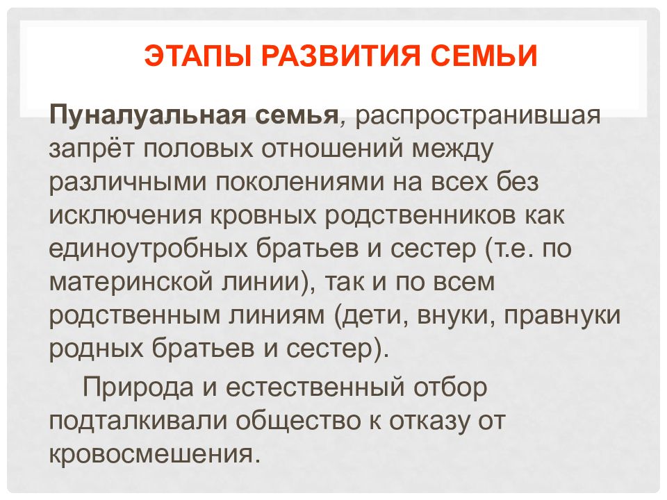 Пуналуальная семья, распространившая запрёт половых отношений между различными поколениями на всех без исключения кровных родственников как единоутробных братьев и сестер (т.е. по материнской линии), так и по всем родственным линиям (дети, внуки, правнуки родных братьев и сестер). Природа и естественный отбор подталкивали общество к отказу от кровосмешения.