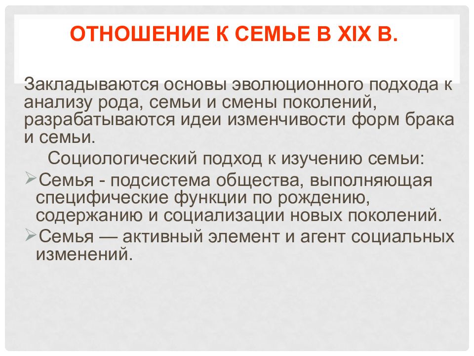 З акладываются основы эволюционного подхода к анализу рода, семьи и смены поколений, разрабатываются идеи изменчивости форм брака и семьи. Социологический подход к изучению семьи: Семья - подсистема общества, выполняющая специфические функции по рождению, содержанию и социализации новых поколений. Семья — активный элемент и агент социальных изменений.