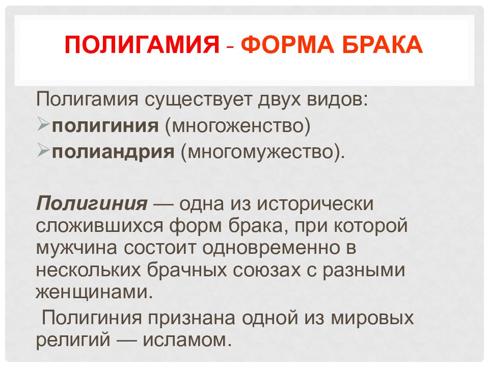 Полигамия существует двух видов: полигиния (многоженство) полиандрия (многомужество). Полигиния — одна из исторически сложившихся форм брака, при которой мужчина состоит одновременно в нескольких брачных союзах с разными женщинами. Полигиния признана одной из мировых религий — исламом.