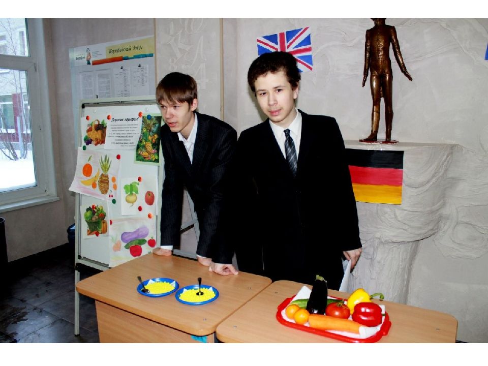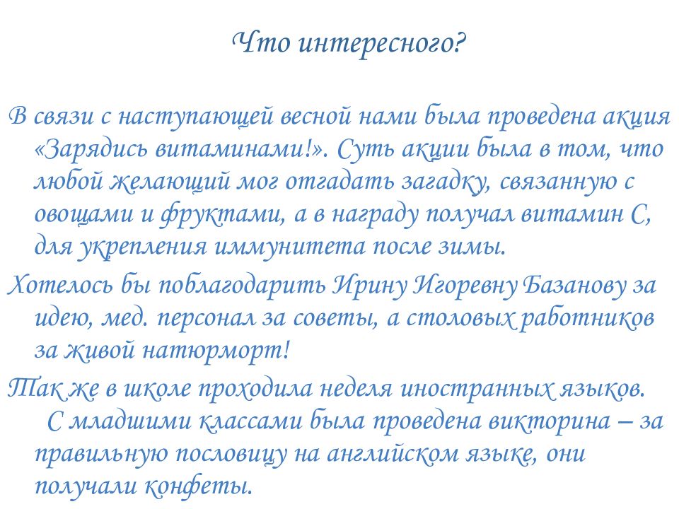 В связи с наступающей весной нами была проведена акция «Зарядись витаминами!». Суть акции была в том, что любой желающий мог отгадать загадку, связанную с овощами и фруктами, а в награду получал витамин C, для укрепления иммунитета после зимы. Хотелось бы поблагодарить Ирину Игоревну Базанову за идею, мед. персонал за советы, а столовых работников за живой натюрморт! Так же в школе проходила неделя иностранных языков. С младшими классами была проведена викторина – за правильную пословицу на английском языке, они получали конфеты. Что интересного?
