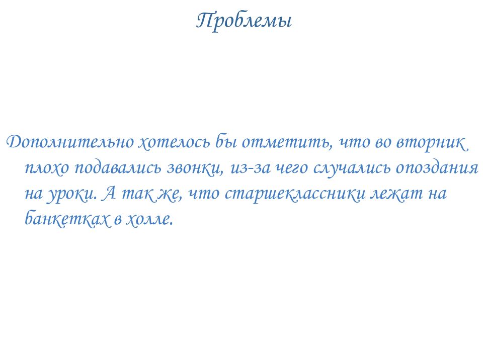 Дополнительно хотелось бы отметить, что во вторник плохо подавались звонки, из-за чего случались опоздания на уроки. А так же, что старшеклассники лежат на банкетках в холле. Проблемы