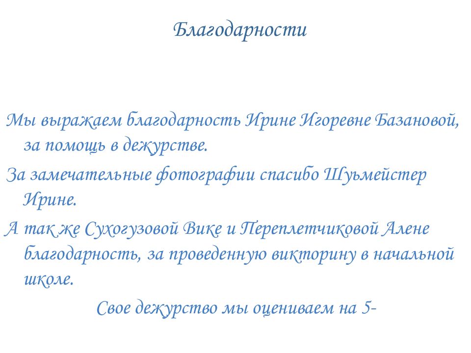 Мы выражаем благодарность Ирине Игоревне Базановой, за помощь в дежурстве. За замечательные фотографии спасибо Шуьмейстер Ирине. А так же Сухогузовой Вике и Переплетчиковой Алене благодарность, за проведенную викторину в начальной школе. Свое дежурство мы оцениваем на 5- Благодарности