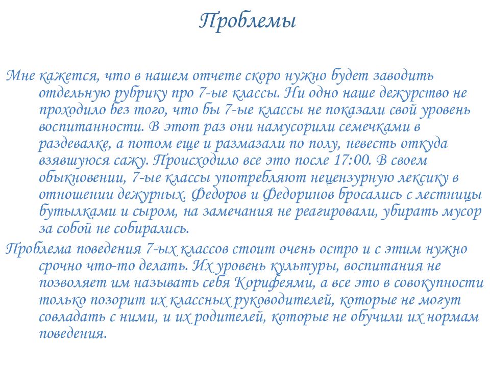 Мне кажется, что в нашем отчете скоро нужно будет заводить отдельную рубрику про 7-ые классы. Ни одно наше дежурство не проходило без того, что бы 7-ые классы не показали свой уровень воспитанности. В этот раз они намусорили семечками в раздевалке, а потом еще и размазали по полу, невесть откуда взявшуюся сажу. Происходило все это после 17:00. В своем обыкновении, 7-ые классы употребляют нецензурную лексику в отношении дежурных. Федоров и Федоринов бросались с лестницы бутылками и сыром, на замечания не реагировали, убирать мусор за собой не собирались. Проблема поведения 7-ых классов стоит очень остро и с этим нужно срочно что-то делать. Их уровень культуры, воспитания не позволяет им называть себя Корифеями, а все это в совокупности только позорит их классных руководителей, которые не могут совладать с ними, и их родителей, которые не обучили их нормам поведения. Проблемы