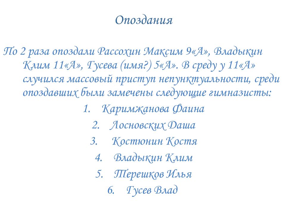 Опоздания По 2 раза опоздали Рассохин Максим 9«А», Владыкин Клим 11«А», Гусева (имя?) 5«А». В среду у 11«А» случился массовый приступ непунктуальности, среди опоздавших были замечены следующие гимназисты: Каримжанова Фаина Лосновских Даша Костюнин Костя Владыкин Клим Терешков Илья Гусев Влад