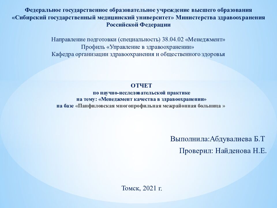 Выполнила:Абдувалиева Б.Т Проверил: Найденова Н.Е. ОТЧЕТ по научно-исследовательской практике на тему: «Менеджмент качества в здравоохранении» на базе «Панфиловская многопрофильная межрайонная больница » Федеральное государственное образовательное учреждение высшего образования «Сибирский государственный медицинский университет» Министерства здравоохранения Российской Федерации Направление подготовки (специальность) 38.04.02 «Менеджмент» Профиль «Управление в здравоохранении» Кафедра организации здравоохранения и общественного здоровья Томск, 2021 г.