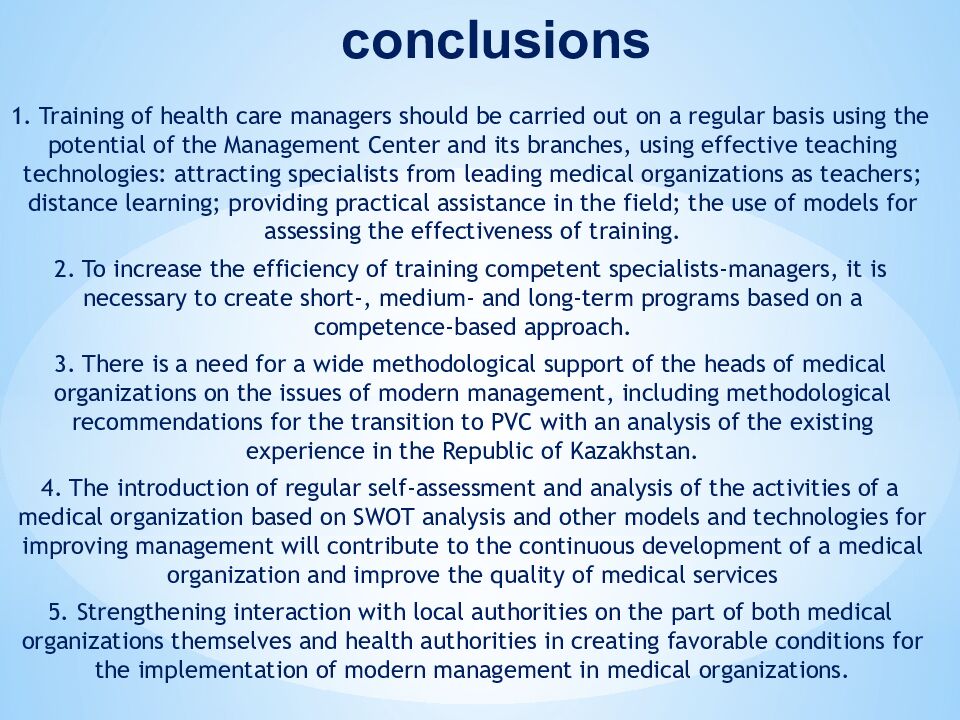 1. Training of health care managers should be carried out on a regular basis using the potential of the Management Center and its branches, using effective teaching technologies: attracting specialists from leading medical organizations as teachers; distance learning; providing practical assistance in the field; the use of models for assessing the effectiveness of training. 2. To increase the efficiency of training competent specialists-managers, it is necessary to create short-, medium- and long-term programs based on a competence-based approach. 3. There is a need for a wide methodological support of the heads of medical organizations on the issues of modern management, including methodological recommendations for the transition to PVC with an analysis of the existing experience in the Republic of Kazakhstan. 4. The introduction of regular self-assessment and analysis of the activities of a medical organization based on SWOT analysis and other models and technologies for improving management will contribute to the continuous development of a medical organization and improve the quality of medical services 5. Strengthening interaction with local authorities on the part of both medical organizations themselves and health authorities in creating favorable conditions for the implementation of modern management in medical organizations.