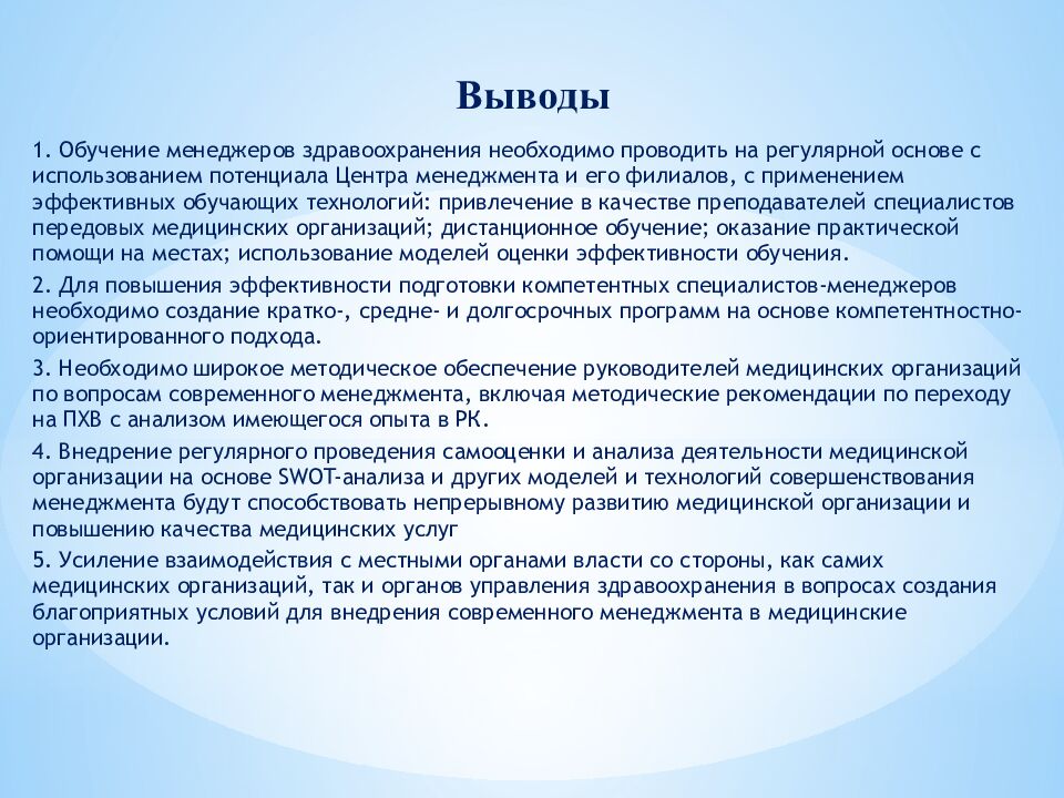 1. Обучение менеджеров здравоохранения необходимо проводить на регулярной основе с использованием потенциала Центра менеджмента и его филиалов, с применением эффективных обучающих технологий: привлечение в качестве преподавателей специалистов передовых медицинских организаций; дистанционное обучение; оказание практической помощи на местах; использование моделей оценки эффективности обучения. 2. Для повышения эффективности подготовки компетентных специалистов-менеджеров необходимо создание кратко-, средне- и долгосрочных программ на основе компетентностно -ориентированного подхода. 3. Необходимо широкое методическое обеспечение руководителей медицинских организаций по вопросам современного менеджмента, включая методические рекомендации по переходу на ПХВ с анализом имеющегося опыта в РК. 4. Внедрение регулярного проведения самооценки и анализа деятельности медицинской организации на основе SWOT-анализа и других моделей и технологий совершенствования менеджмента будут способствовать непрерывному развитию медицинской организации и повышению качества медицинских услуг 5. Усиление взаимодействия с местными органами власти со стороны, как самих медицинских организаций, так и органов управления здравоохранения в вопросах создания благоприятных условий для внедрения современного менеджмента в медицинские организации.