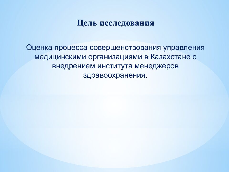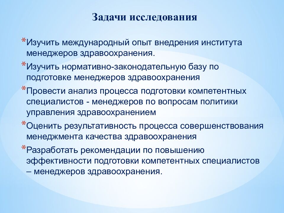 Изучить международный опыт внедрения института менеджеров здравоохранения. Изучить нормативно-законодательную базу по подготовке менеджеров здравоохранения Провести анализ процесса подготовки компетентных специалистов - менеджеров по вопросам политики управления здравоохранением Оценить результативность процесса совершенствования менеджмента качества здравоохранения Разработать рекомендации по повышению эффективности подготовки компетентных специалистов – менеджеров здравоохранения.