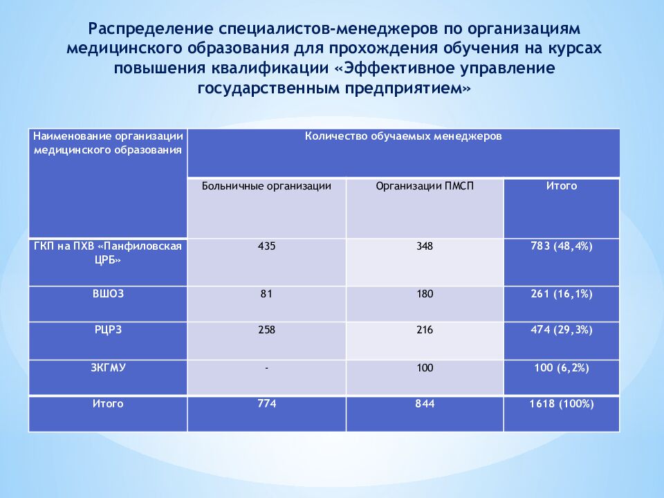Наименование организации медицинского образования Количество обучаемых менеджеров Больничные организации Организации ПМСП Итого ГКП на ПХВ «Панфиловская ЦРБ» 435 348 783 (48,4%) ВШОЗ 81 180 261 (16,1%) РЦРЗ 258 216 474 (29,3%) ЗКГМУ - 100 100 (6,2%) Итого 774 844 1618 (100%)