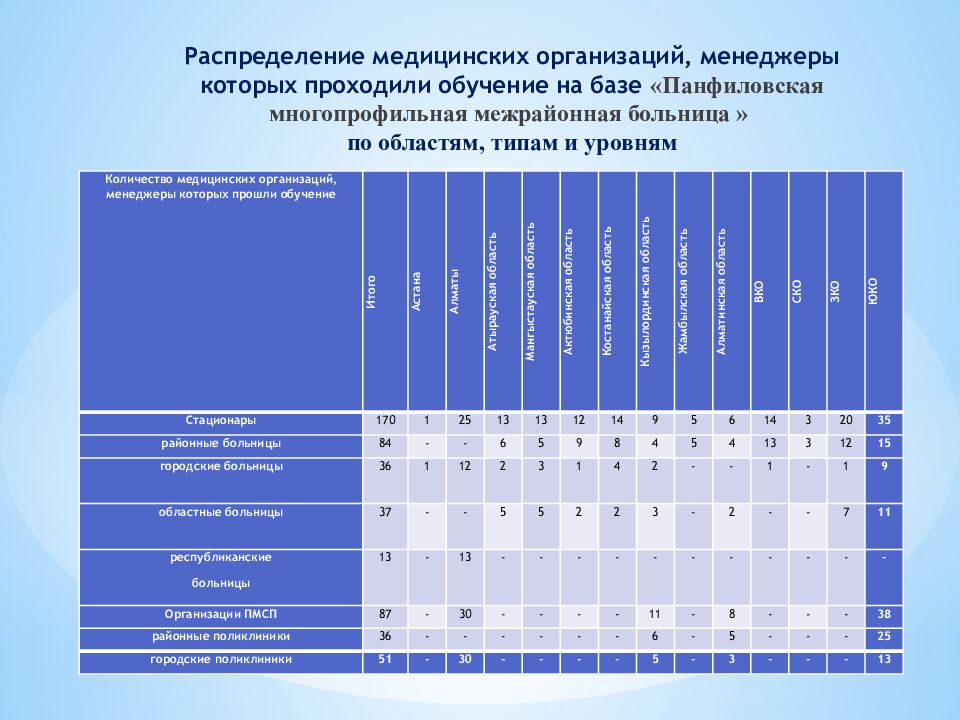 Количество медицинских организаций, менеджеры которых прошли обучение Итого Астана Алматы Атырауская область Мангыстауская область Актюбинская область Костанайская область Кызылординская область Жамбылская область Алматинская область ВКО СКО ЗКО ЮКО Стационары 170 1 25 13 13 12 14 9 5 6 14 3 20 35 районные больницы 84 - - 6 5 9 8 4 5 4 13 3 12 15 городские больницы 36 1 12 2 3 1 4 2 - - 1 - 1 9 областные больницы 37 - - 5 5 2 2 3 - 2 - - 7 11 республиканские больницы 13 - 13 - - - - - - - - - - - Организации ПМСП 87 - 30 - - - - 11 - 8 - - - 38 районные поликлиники 36 - - - - - - 6 - 5 - - - 25 городские поликлиники 51 - 30 - - - - 5 - 3 - - - 13