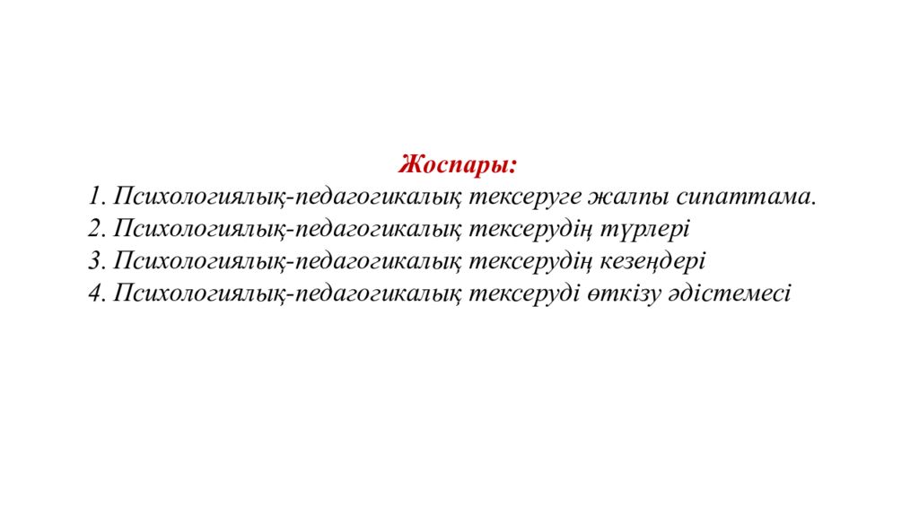 Жоспары : Психологиялық-педагогикалық тексеруге жалпы сипаттама. Психологиялық-педагогикалық тексерудің түрлері Психологиялық-педагогикалық тексерудің кезеңдері Психологиялық-педагогикалық тексеруді өткізу әдістемесі