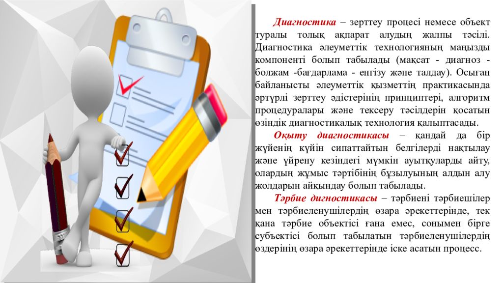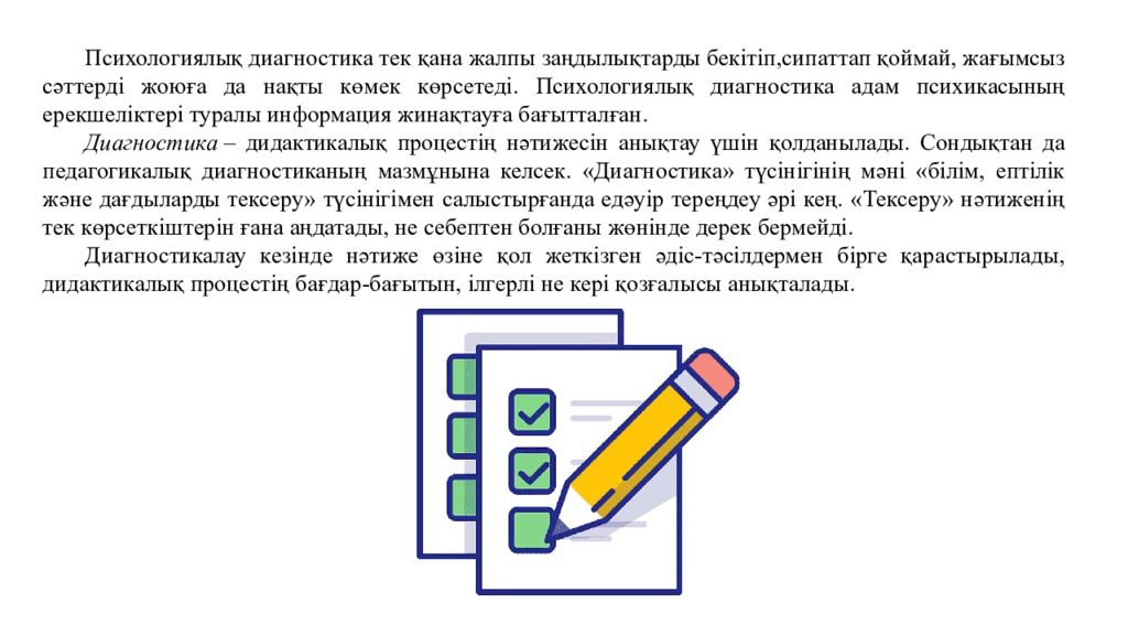 Психологиялық диагностика тек қана жалпы заңдылықтарды бекітіп,сипаттап қоймай, жағымсыз сәттерді жоюға да нақты көмек көрсетеді. Психологиялық диагностика адам психикасының ерекшеліктері туралы информация жинақтауға бағытталған. Диагностика – дидактикалық процестің нәтижесін анықтау үшін қолданылады. Сондықтан да педагогикалық диагностиканың мазмұнына келсек. «Диагностика» түсінігінің мәні « білім, ептілік және дағдыларды тексеру » түсінігімен салыстырғанда едәуір тереңдеу әрі кең. « Тексеру » нәтиженің тек көрсеткіштерін ғана аңдатады, не себептен болғаны жөнінде дерек бермейді. Диагностикалау кезінде нәтиже өзіне қол жеткізген әдіс-тәсілдермен бірге қарастырылады, дидактикалық процестің бағдар-бағытын, ілгерлі не кері қозғалысы анықталады.