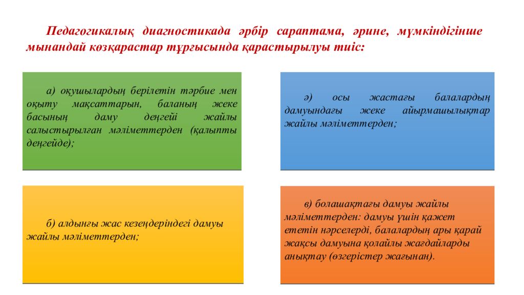 П едагогикалық диагностикада әрбір сараптама, әрине, мүмкіндігінше мынандай көзқарастар тұрғысында қарастырылуы тиіс : а) оқушылардың берілетін тәрбие мен оқыту мақсаттарын, баланың жеке басының даму деңгейі жайлы салыстырылған мәліметтерден ( қалыпты деңгейде ); в) болашақтағы дамуы жайлы мәліметтерден : дамуы үшін қажет ететін нәрселерді, балалардың ары қарай жақсы дамуына қолайлы жағдайларды анықтау ( өзгерістер жағынан ). ә) осы жастағы балалардың дамуындағы жеке айырмашылықтар жайлы мәліметтерден ; б) алдынғы жас кезеңдеріндегі дамуы жайлы мәліметтерден ;