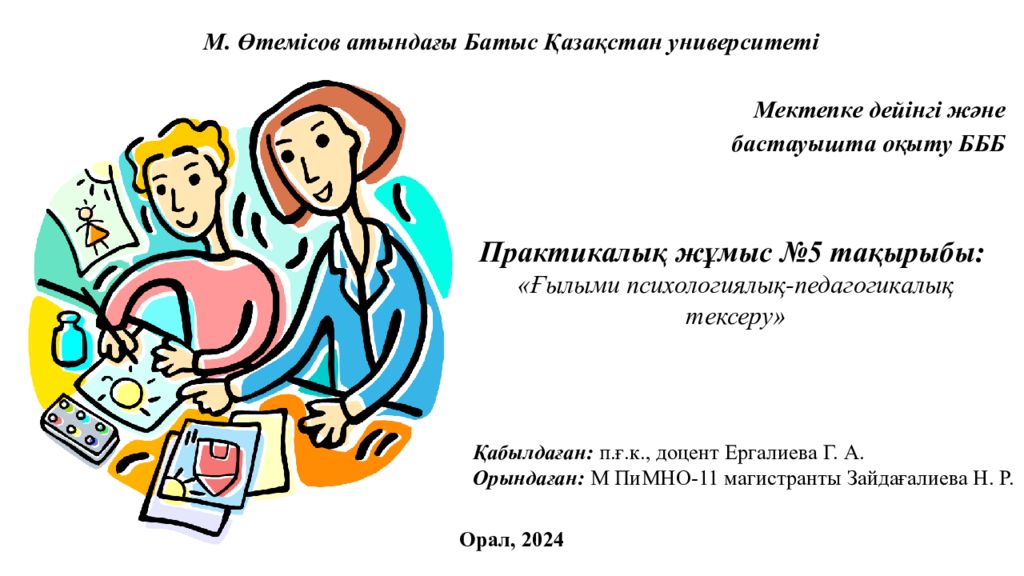 М. Өтемісов атындағы Батыс Қазақстан университеті Мектепке дейінгі және бастауышта оқыту БББ Практикалық жұмыс №5 т ақырыбы: « Ғылыми психологиялық-педагогикалық тексеру » Қабылдаған: п.ғ.к., доцент Ергалиева Г. А. Орындаған: М ПиМНО-11 магистранты Зайдағалиева Н. Р. Орал, 2024