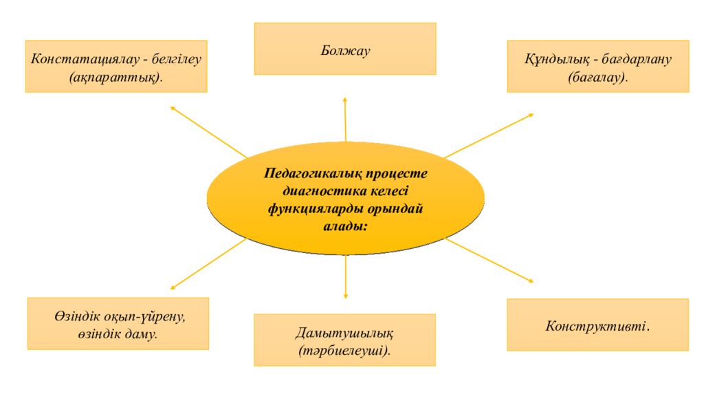 Педагогикалық процесте диагностика келесі функцияларды орындай алады : Болжау Дамытушылық ( тәрбиелеуші ). Констатациялау - белгілеу ( ақпараттық ). Өзіндік оқып-үйрену, өзіндік даму. Құндылық - бағдарлану ( бағалау ). Конструктивті.