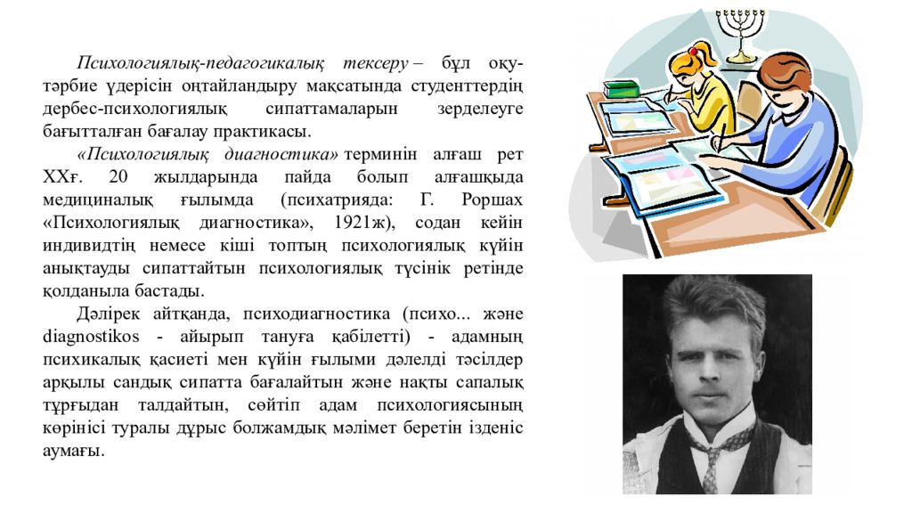 Психологиялық-педагогикалық тексеру – бұл оқу-тәрбие үдерісін оңтайландыру мақсатында студенттердің дербес-психологиялық сипаттамаларын зерделеуге бағытталған бағалау практикасы. « Психологиялық диагностика» терминін алғаш рет ХХғ. 20 жылдарында пайда болып алғашқыда медициналық ғылымда ( психатрияда : Г. Роршах « Психологиялық диагностика», 1921ж), содан кейін индивидтің немесе кіші топтың психологиялық күйін анықтауды сипаттайтын психологиялық түсінік ретінде қолданыла бастады. Дәлірек айтқанда, психодиагностика (психо... және diagnostikos - айырып тануға қабілетті ) - адамның психикалық қасиеті мен күйін ғылыми дәлелді тәсілдер арқылы сандық сипатта бағалайтын және нақты сапалық тұрғыдан талдайтын, сөйтіп адам психологиясының көрінісі туралы дұрыс болжамдық мәлімет беретін ізденіс аумағы.