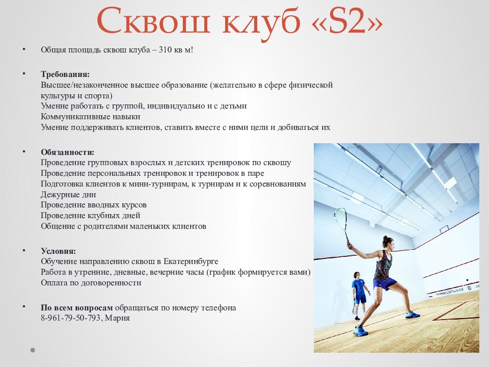 Общая площадь сквош клуба – 310 кв м! Требования: Высшее/незаконченное высшее образование (желательно в сфере физической культуры и спорта) Умение работать с группой, индивидуально и с детьми Коммуникативные навыки Умение поддерживать клиентов, ставить вместе с ними цели и добиваться их Обязанности: Проведение групповых взрослых и детских тренировок по сквошу Проведение персональных тренировок и тренировок в паре Подготовка клиентов к мини-турнирам, к турнирам и к соревнованиям Дежурные дни Проведение вводных курсов Проведение клубных дней Общение с родителями маленьких клиентов Условия: Обучение направлению сквош в Екатеринбурге Работа в утренние, дневные, вечерние часы (график формируется вами) Оплата по договоренности По всем вопросам обращаться по номеру телефона 8-961-79-50-793, Мария