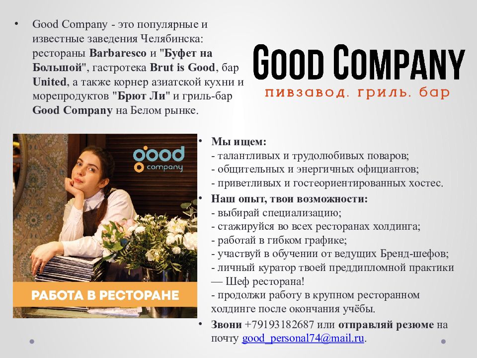 Good Company - это популярные и известные заведения Челябинска: рестораны Barbaresco и " Буфет на Большой ", гастротека Brut is Good, бар United, а также корнер азиатской кухни и морепродуктов " Брют Ли " и гриль-бар Good Company на Белом рынке. Мы ищем: - талантливых и трудолюбивых поваров; - общительных и энергичных официантов; - приветливых и гостеориентированных хостес. Наш опыт, твои возможности: - выбирай специализацию; - стажируйся во всех ресторанах холдинга; - работай в гибком графике; - участвуй в обучении от ведущих Бренд-шефов; - личный куратор твоей преддипломной практики — Шеф ресторана! - продолжи работу в крупном ресторанном холдинге после окончания учёбы. Звони +79193182687 или отправляй резюме на почту good_personal74@mail.ru.