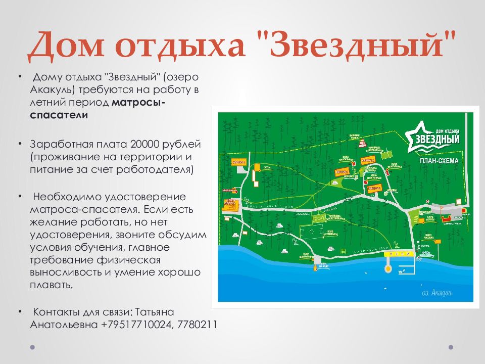 Дому отдыха "Звездный" (озеро Акакуль ) требуются на работу в летний период матросы-спасатели Заработная плата 20000 рублей (проживание на территории и питание за счет работодателя) Необходимо удостоверение матроса-спасателя. Если есть желание работать, но нет удостоверения, звоните обсудим условия обучения, главное требование физическая выносливость и умение хорошо плавать. Контакты для связи: Татьяна Анатольевна +79517710024, 7780211