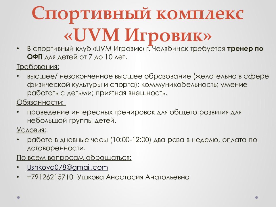 Последний слайд презентации: Открытые вакансии для студентов: Спортивный комплекс « UVM Игровик »