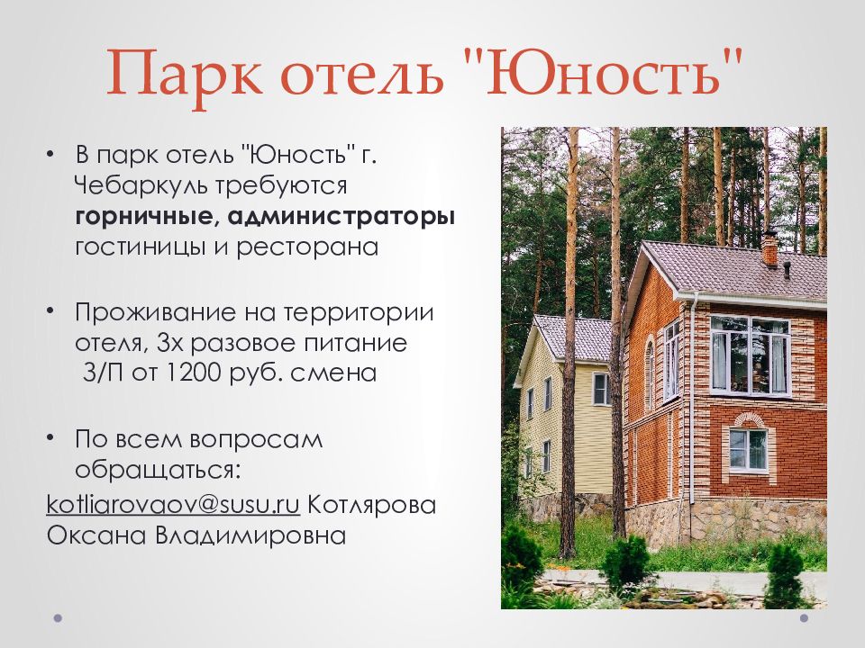 В парк отель "Юность" г. Чебаркуль требуются горничные, администраторы гостиницы и ресторана Проживание на территории отеля, 3х разовое питание З/П от 1200 руб. смена По всем вопросам обращаться: kotliarovaov@susu.ru Котлярова Оксана Владимировна