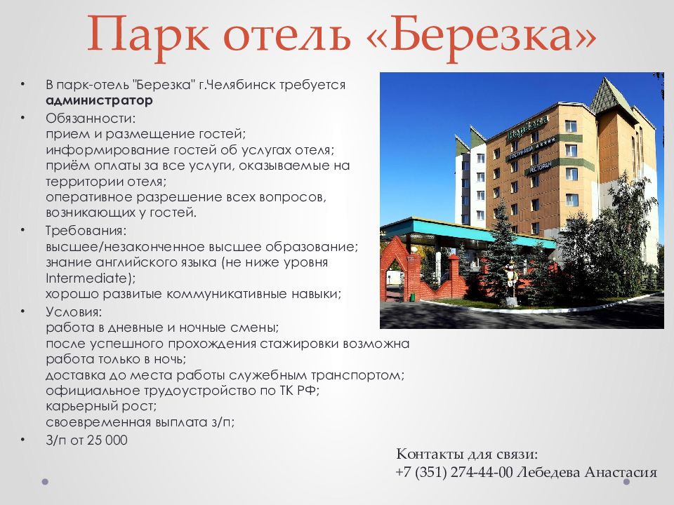 В парк-отель "Березка" г.Челябинск требуется администратор Обязанности: прием и размещение гостей; информирование гостей об услугах отеля; приём оплаты за все услуги, оказываемые на территории отеля; оперативное разрешение всех вопросов, возникающих у гостей. Требования: высшее/незаконченное высшее образование; знание английского языка (не ниже уровня Intermediate ); хорошо развитые коммуникативные навыки; Условия: работа в дневные и ночные смены; после успешного прохождения стажировки возможна работа только в ночь; доставка до места работы служебным транспортом; официальное трудоустройство по ТК РФ; карьерный рост; своевременная выплата з/п; З/п от 25 000 Контакты для связи: +7 (351) 274-44-00 Лебедева Анастасия