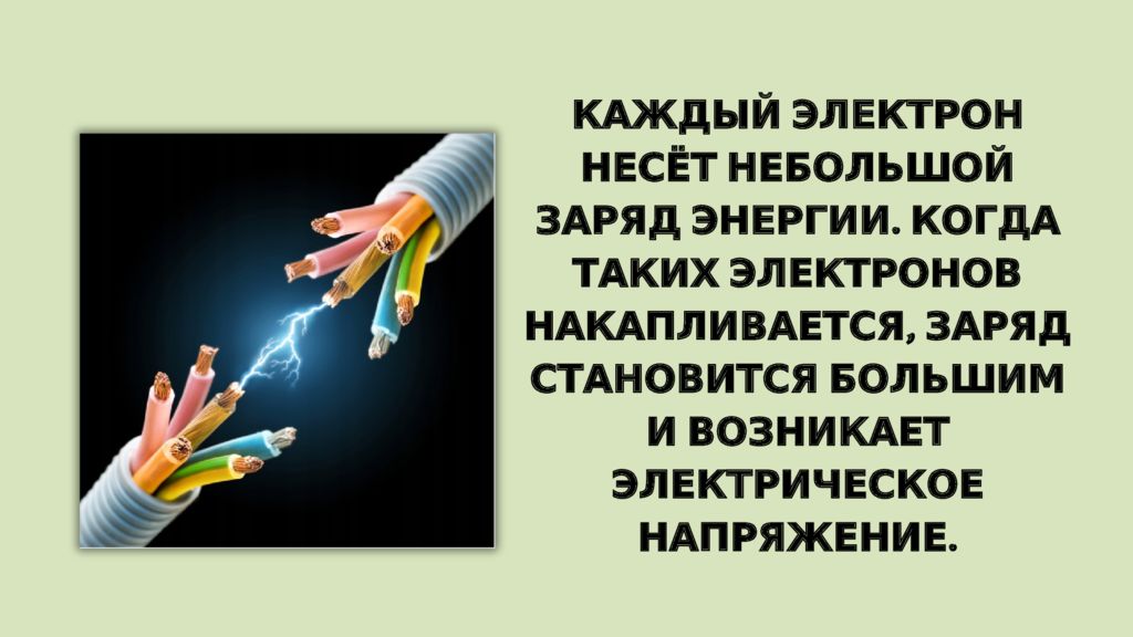 КАЖДЫЙ ЭЛЕКТРОН НЕСЁТ НЕБОЛЬШОЙ ЗАРЯД ЭНЕРГИИ. КОГДА ТАКИХ ЭЛЕКТРОНОВ НАКАПЛИВАЕТСЯ, ЗАРЯД СТАНОВИТСЯ БОЛЬШИМ И ВОЗНИКАЕТ ЭЛЕКТРИЧЕСКОЕ НАПРЯЖЕНИЕ.
