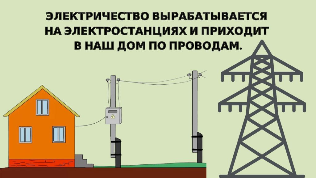 ЭЛЕКТРИЧЕСТВО ВЫРАБАТЫВАЕТСЯ НА ЭЛЕКТРОСТАНЦИЯХ И ПРИХОДИТ В НАШ ДОМ ПО ПРОВОДАМ.