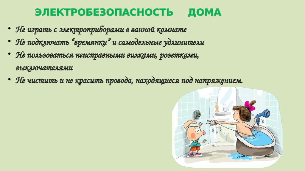 Тянуть вилку из розетки за провод пользоваться неисправными электроприборами и поврежденными розетками самостоятельно ремонтировать и разбирать электроприборы прикасаться к осветлительным приборам мокрыми руками. ЗАПРЕЩАЕТСЯ