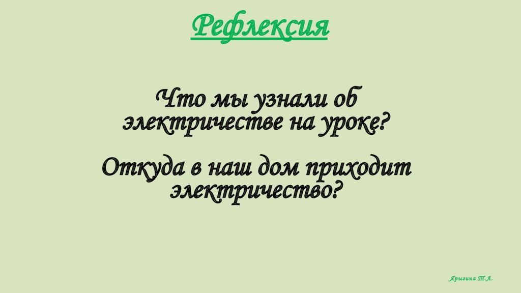 Рефлексия Ярыгина Т.А. Что мы узнали о б электричестве на уроке ? Откуда в наш дом приходит электричество ?