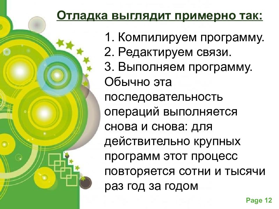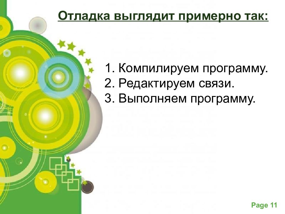 1. Компилируем программу. 2. Редактируем связи. 3. Выполняем программу. Обычно эта последовательность операций выполняется снова и снова : для действительно крупных программ этот процесс повторяется сотни и тысячи раз год за годом Отладка выглядит примерно так: