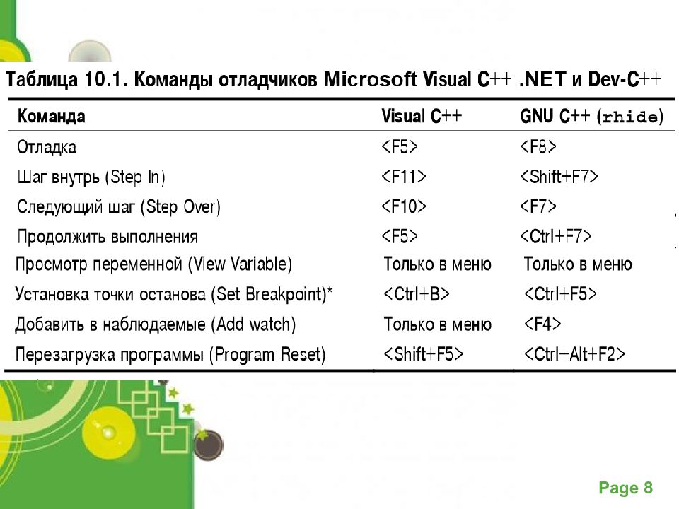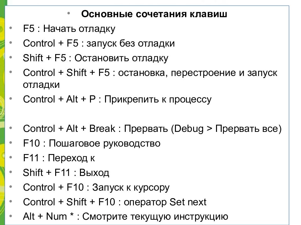 Основные сочетания клавиш F5 : Начать отладку Control + F5 : запуск без отладки Shift + F5 : Остановить отладку Control + Shift + F5 : остановка, перестроение и запуск отладки Control + Alt + P : Прикрепить к процессу Control + Alt + Break : Прервать ( Debug > Прервать все) F10 : Пошаговое руководство F11 : Переход к Shift + F11 : Выход Control + F10 : Запуск к курсору Control + Shift + F10 : оператор Set next Alt + Num * : Смотрите текущую инструкцию