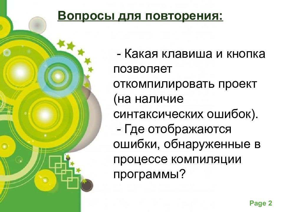Вопросы для повторения: - Какая клавиша и кнопка позволяет откомпилировать проект (на наличие синтаксических ошибок). - Где отображаются ошибки, обнаруженные в процессе компиляции программы?