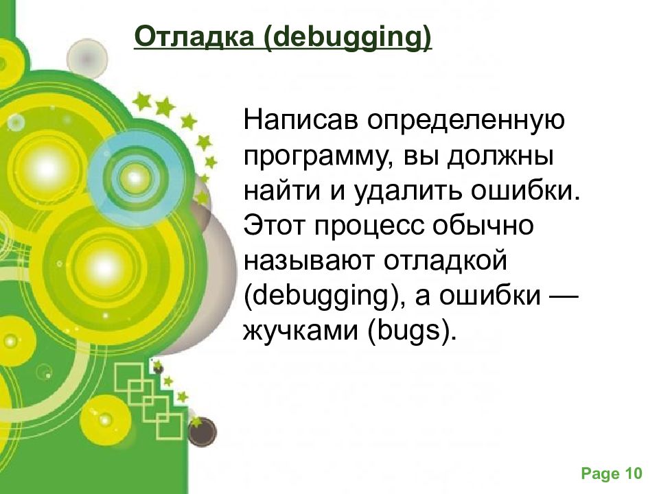 Отладка (debugging) Написав определенную программу, вы должны найти и удалить ошибки. Этот процесс обычно называют отладкой (debugging), а ошибки — жучками (bugs).
