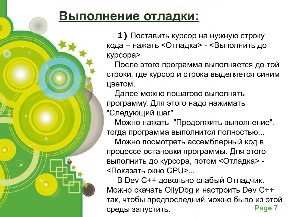 Выполнение отладки: 1) Поставить курсор на нужную строку кода – нажать < Отладка > - < Выполнить до курсора > После этого программа выполняется до той строки, где курсор и строка выделяется синим цветом. Далее можно пошагово выполнять программу. Для этого надо нажимать " Следующий шаг " Можно нажать " Продолжить выполнение ", тогда программа выполнится полностью... Можно посмотреть ассемблерный код в процессе остановки программы. Для этого выполнить до курсора, потом < Отладка > - < Показать окно CPU>... В Dev C++ довольно слабый Отладчик. Можно скачать OllyDbg и настроить Dev C++ так, чтобы предпоследний можно было из этой среды запустить.