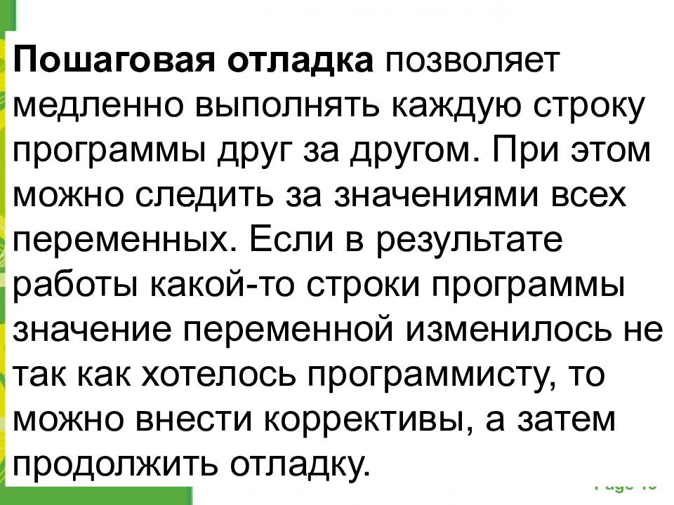 Пошаговая отладка позволяет медленно выполнять каждую строку программы друг за другом. При этом можно следить за значениями всех переменных. Если в результате работы какой-то строки программы значение переменной изменилось не так как хотелось программисту, то можно внести коррективы, а затем продолжить отладку.