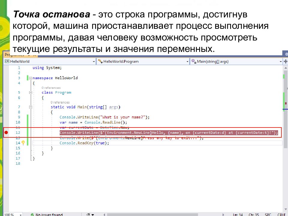 Точка останова - это строка программы, достигнув которой, машина приостанавливает процесс выполнения программы, давая человеку возможность просмотреть текущие результаты и значения переменных.