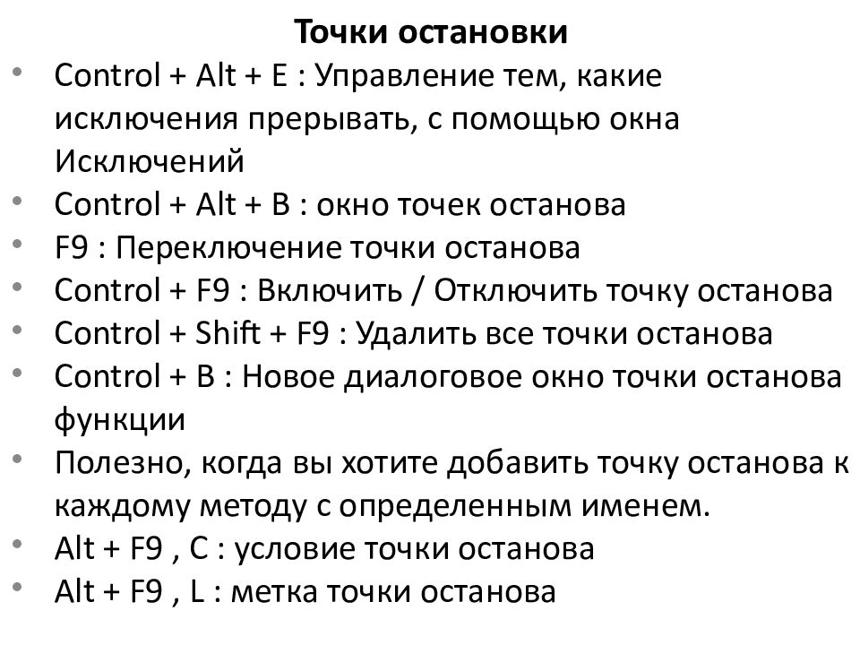 Точки остановки Control + Alt + E : Управление тем, какие исключения прерывать, с помощью окна Исключений Control + Alt + B : окно точек останова F9 : Переключение точки останова Control + F9 : Включить / Отключить точку останова Control + Shift + F9 : Удалить все точки останова Control + B : Новое диалоговое окно точки останова функции Полезно, когда вы хотите добавить точку останова к каждому методу с определенным именем. Alt + F9 , C : условие точки останова Alt + F9 , L : метка точки останова