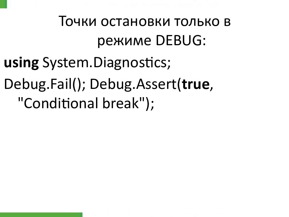 Точки останов ки только в режиме DEBUG: using System.Diagnostics ; Debug.Fail (); Debug.Assert ( true, "Conditional break" );