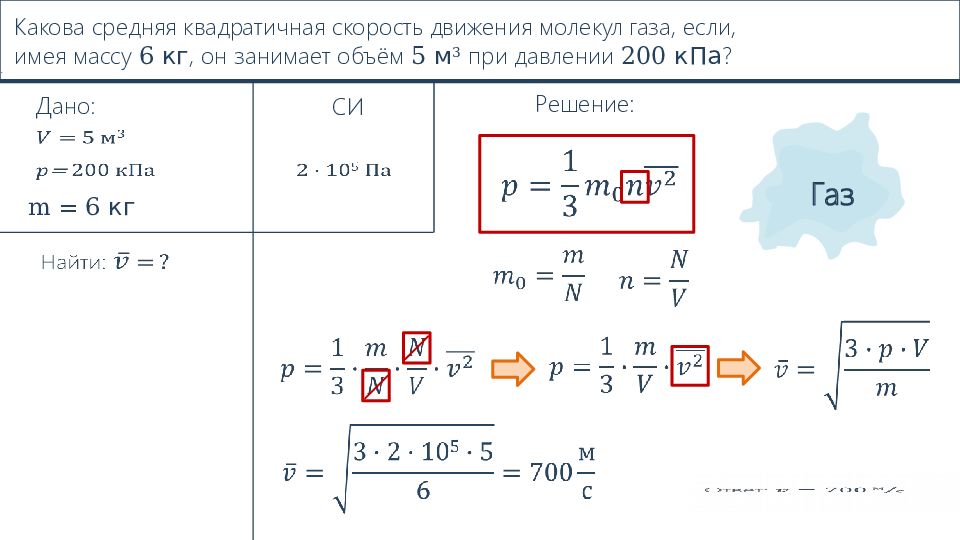Рассчитайте давление, оказываемое молекулами азота на стенки сосуда, если средний квадрат скорости движения его молекул равен 0,5·10 6 м 2 /с 2, а плотность азота 1,25 кг/м 3. Дано: Решение: ρ = 1,25 кг/м 3