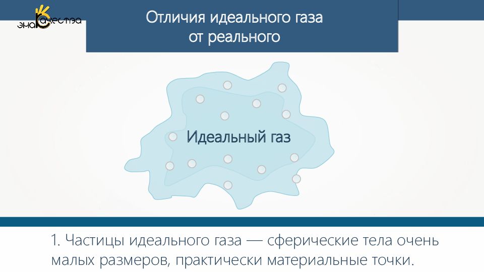 Отличия идеального газа от реального 1. Частицы идеального газа — сферические тела очень малых размеров, практически материальные точки. Идеальный газ