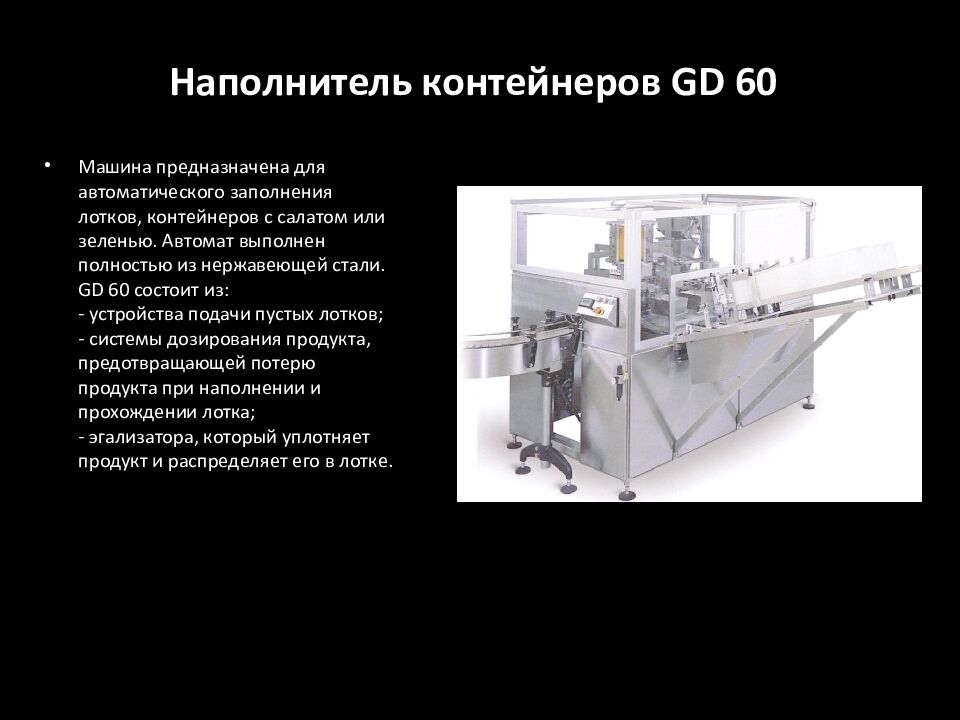 Машина предназначена для автоматического заполнения лотков, контейнеров с салатом или зеленью. Автомат выполнен полностью из нержавеющей стали. GD 60 состоит из: - устройства подачи пустых лотков; - системы дозирования продукта, предотвращающей потерю продукта при наполнении и прохождении лотка; - эгализатора, который уплотняет продукт и распределяет его в лотке.