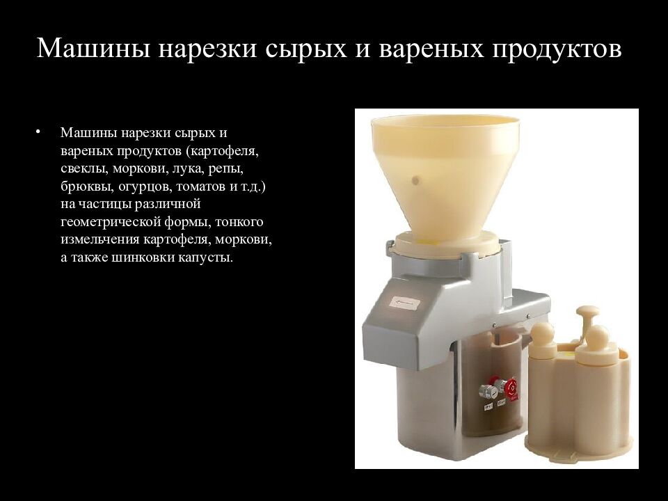 Машины нарезки сырых и вареных продуктов (картофеля, свеклы, моркови, лука, репы, брюквы, огурцов, томатов и т.д.) на частицы различной геометрической формы, тонкого измельчения картофеля, моркови, а также шинковки капусты.