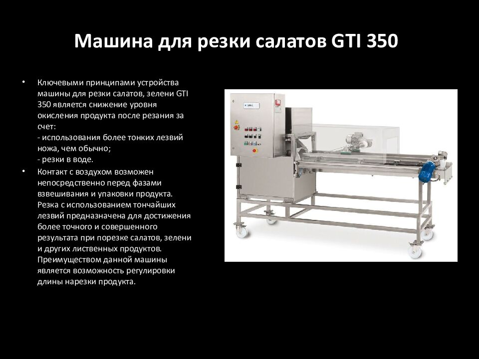 Ключевыми принципами устройства машины для резки салатов, зелени GTI 350 является снижение уровня окисления продукта после резания за счет: - использования более тонких лезвий ножа, чем обычно; - резки в воде. Контакт с воздухом возможен непосредственно перед фазами взвешивания и упаковки продукта. Резка с использованием тончайших лезвий предназначена для достижения более точного и совершенного результата при порезке салатов, зелени и других лиственных продуктов. Преимуществом данной машины является возможность регулировки длины нарезки продукта.