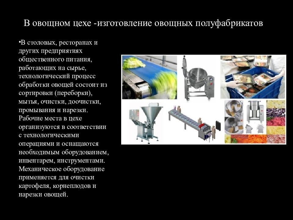 В столовых, ресторанах и других предприятиях общественного питания, работающих на сырье, технологический процесс обработки овощей состоит из сортировки (переборки), мытья, очистки, доочистки, промывания и нарезки. Рабочие места в цехе организуются в соответствии с технологическими операциями и оснащаются необходимым оборудованием, инвентарем, инструментами. Механическое оборудование применяется для очистки картофеля, корнеплодов и нарезки овощей.