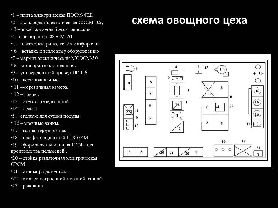 1 – плита электрическая ПЭСМ-4Ш; 2 – сковородка электрическая СЭСМ-0.5; 3 – шкаф жарочный электрический 4– фритюрница. ФЭСМ-20 5 – плита электрическая 2х конфорочная. 6 – вставка к тепловому оборудованию 7 – мармит электрический МСЭСМ-50. 8 – стол производственный. 9 – универсальный привод ПГ-0.6 10 – весы напольные. 11 –морозильная камера. 12 – гриль.. 13 – стелаж передвижной. 14 – дежа.1 5 – стеллаж для сушки посуды. 16 – моечные ванны. 17 – ванна передвижная. 18 – шкаф холодильный ШХ-0,4М. 19 – формовочная машина RC/4- для производства пельменей. 20 – стойка раздаточная электрическая СРСМ 21 – стойка раздаточная. 22 – стол со встроенной моечной ванной. 23 – раковина.