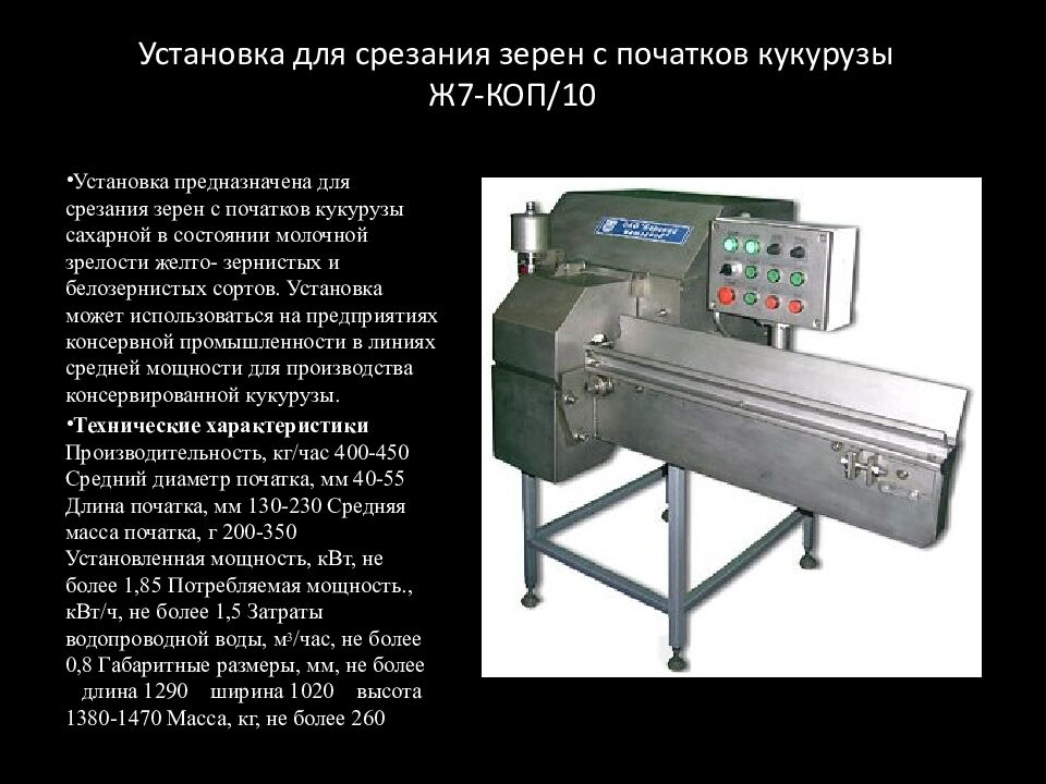 Установка предназначена для срезания зерен с початков кукурузы сахарной в состоянии молочной зрелости желто- зернистых и белозернистых сортов. Установка может использоваться на предприятиях консервной промышленности в линиях средней мощности для производства консервированной кукурузы. Технические характеристики Производительность, кг/час 400-450 Средний диаметр початка, мм 40-55 Длина початка, мм 130-230 Средняя масса початка, г 200-350 Установленная мощность, кВт, не более 1,85 Потребляемая мощность., кВт/ч, не более 1,5 Затраты водопроводной воды, м 3 /час, не более 0,8 Габаритные размеры, мм, не более длина 1290 ширина 1020 высота 1380-1470 Масса, кг, не более 260