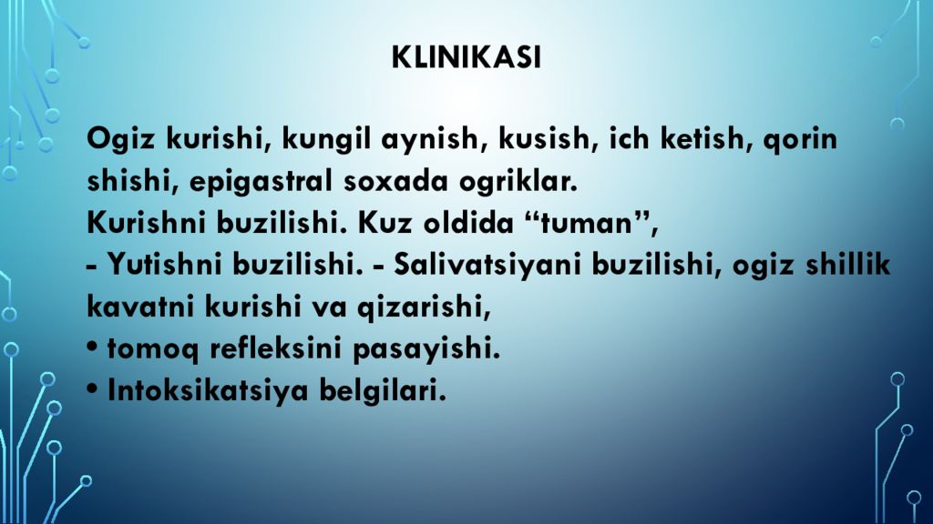 Ogiz kurishi, kungil aynish, kusish, ich ketish, qorin shishi, epigastral soxada ogriklar. Kurishni buzilishi. Kuz oldida “tuman”, - Yutishni buzilishi. - Salivatsiyani buzilishi, ogiz shillik kavatni kurishi va qizarishi, • tomoq refleksini pasayishi. • Intoksikatsiya belgilari.