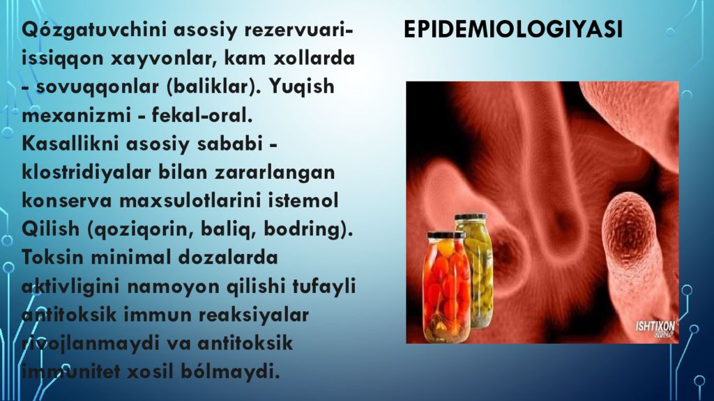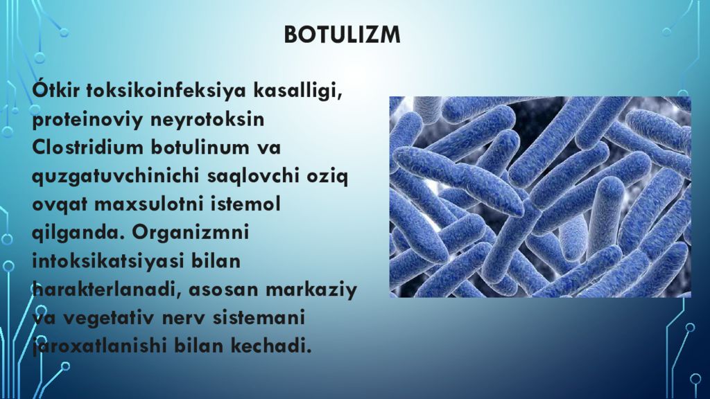 Ótkir toksikoinfeksiya kasalligi, proteinoviy neyrotoksin Clostridium botulinum va quzgatuvchinichi saqlovchi oziq ovqat maxsulotni istemol qilganda. Organizmni intoksikatsiyasi bilan harakterlanadi, asosan markaziy va vegetativ nerv sistemani jaroxatlanishi bilan kechadi.
