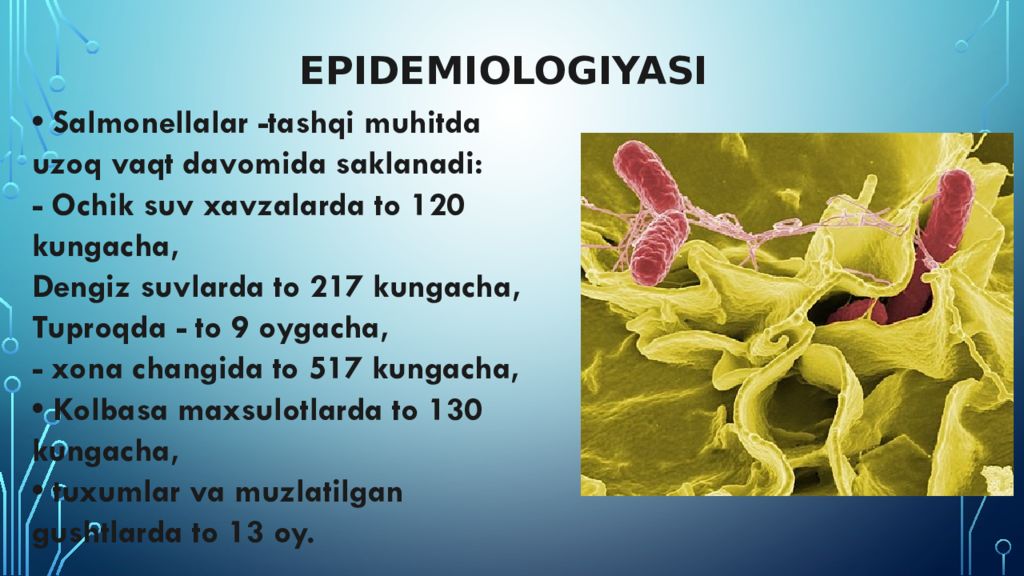 • Salmonellalar -tashqi muhitda uzoq vaqt davomida saklanadi : - Ochik suv xavzalarda to 120 kungacha, Dengiz suvlarda to 217 kungacha, Tuproqda - to 9 oygacha, - xona changida to 517 kungacha, • Kolbasa maxsulotlarda to 130 kungacha, • tuxumlar va muzlatilgan gushtlarda to 13 oy.